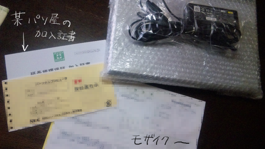 パソ子+アダプター+報告書に保証書と加入証書も並べてみる。