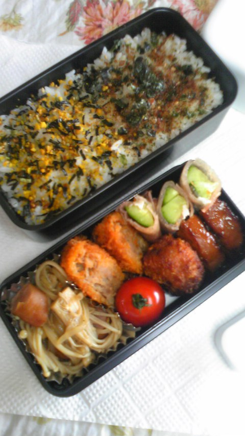 ・ごはん(今日は高菜のお漬物をサンド。のりたま・本かつおのふりかけ)