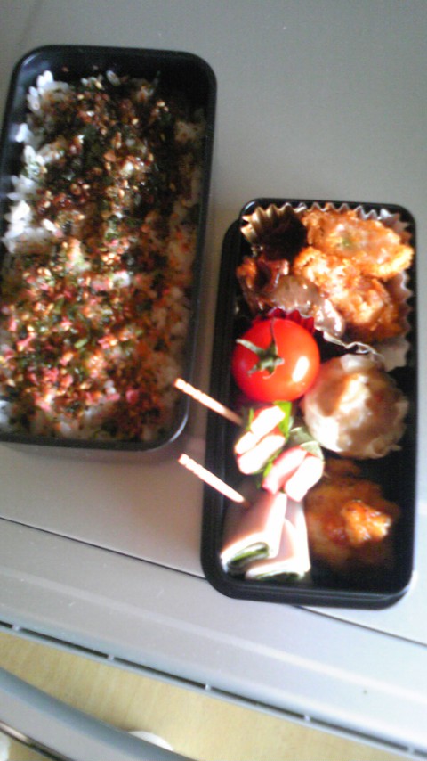 ・ごはん(今日は真ん中におかかを挟みましたーv鮭わかめ&かつおみりんのふりかけ)