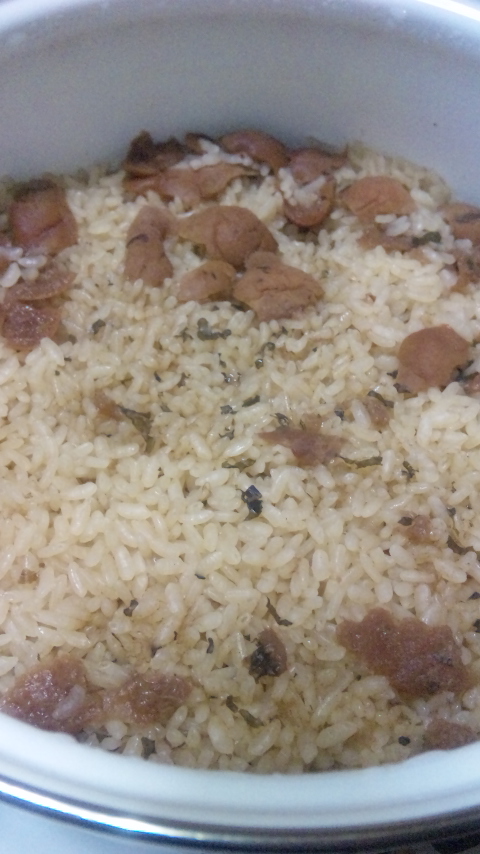 梅干は種を取ってほぐし、適当に調味料(お醤油等)で味付けして炊飯。